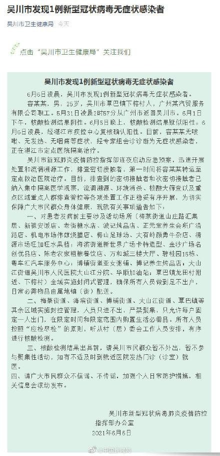 据“吴川市卫生健康局”微信公众号:6月6日凌晨,吴川市发现1例新型冠状病毒无症状感染者。容某某,男,25岁,吴川市覃巴镇下榕村人,广州某汽贸服务有限公司职工。5月31日凌晨2时57分从广州市返回吴川市。6月1日下午,核酸检测结果阴性。6月5日晚上,核酸检测结果疑似阳性。6月6日凌晨,经湛江市疾控中心复核确认阳性。目前,容某某无咳嗽、无发热、无咽痛等症状,经专家组会诊诊断为无症状感染者,正在湛江市定点医院隔离治疗。