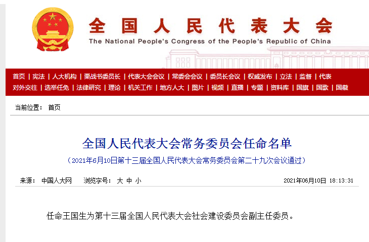 任命王国生为第十三届全国人民代表大会社会建设委员会副主任委员。