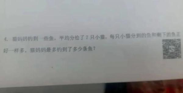 江汉区北湖小学数学老师冯钰娟分析,这个题目提到要将猫妈妈钓到的鱼平均分配给7只小猫,考查的是,有余数的除法里余数要比除数小的概念。有7只小猫,除数就是7,平均分的鱼和剩下的鱼一样多,那余数只可能是1至6。题目又要求猫妈妈最多钓到多少条鱼,那取余数最大的6,所以答案是6×7+6=48。