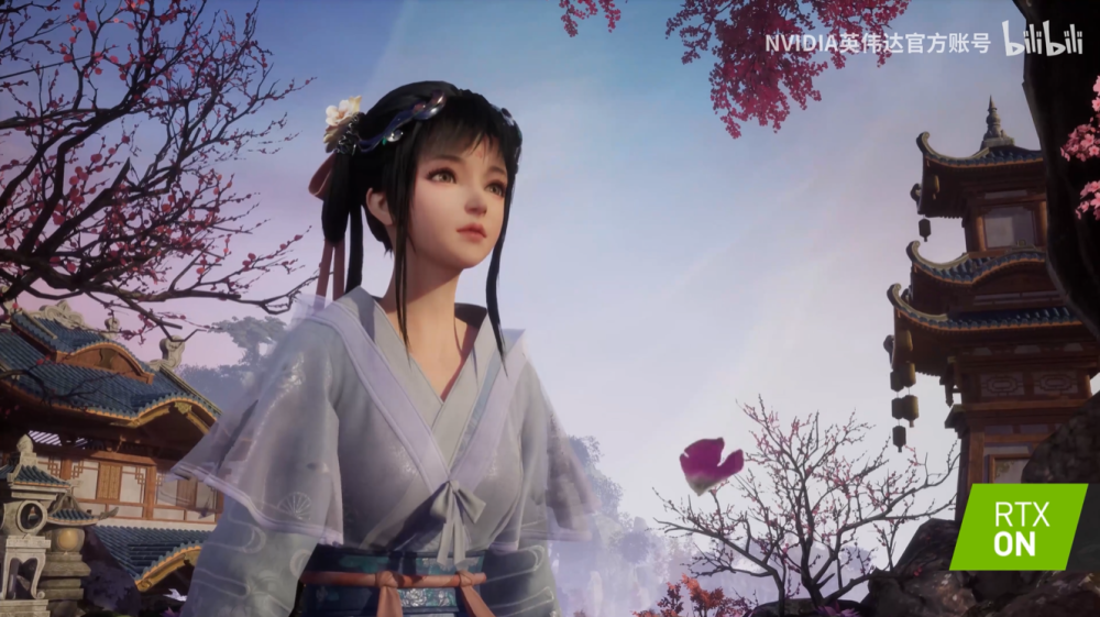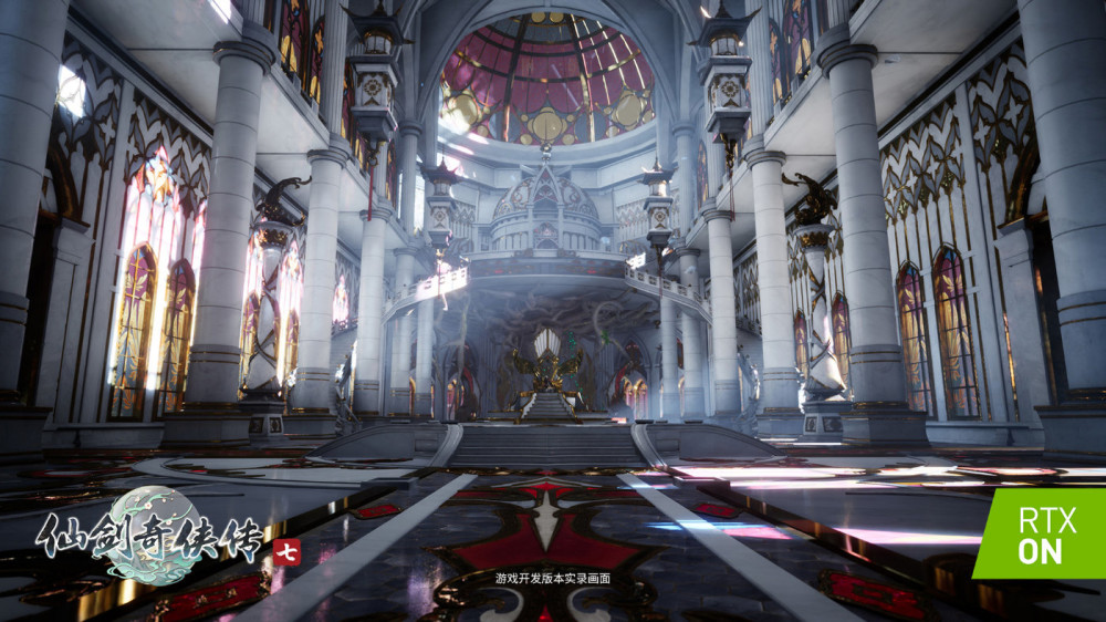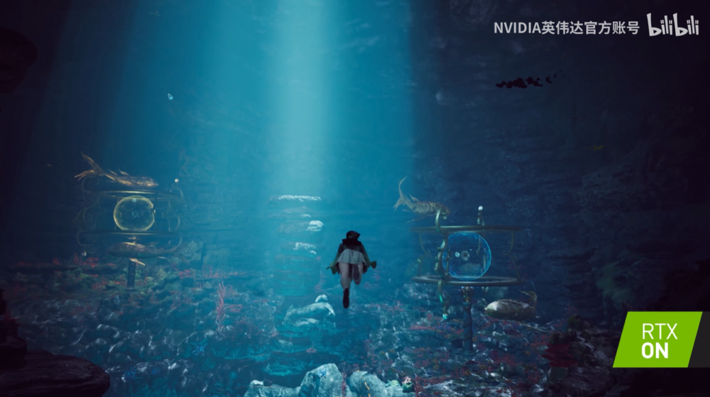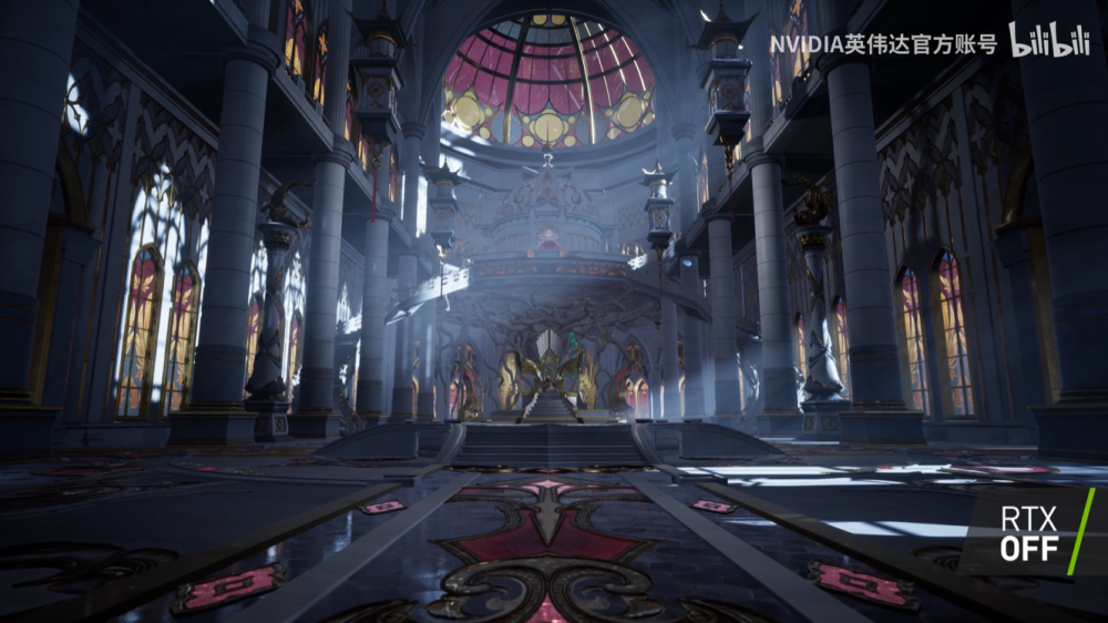在大殿场景,NVIDIAAAPS 技术实时计算生成地面的斑驳色块;全局光照技术可以令大殿中没有被阳光照射的地方同样明亮。不同于传统的全局光实现方式,这里使用 NVIDIA 基于光线追踪的 ReSTIR GI 技术,这种技术使用极低的采样率就可以对各种光照及自发光进行间接光照计算,从而产生与真实物理世界几乎一致的复杂光影效果,同时保持极高的渲染效率,这是用传统渲染方法很难实现的效果与效率的高度平衡。
