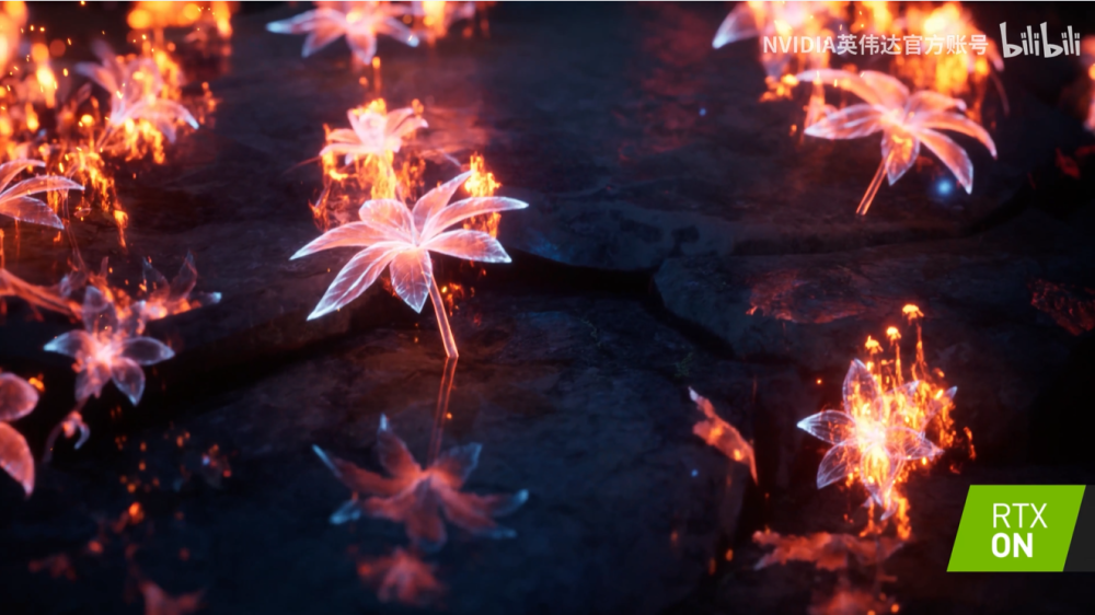 下一个场景,可以看到深红色的洞穴里有着半透明的花朵以及水晶。官方表示,这里使用了 NVIDIA 的 Adaptive Anisotropic Photon Scattering(AAPS)的光线追踪技术,该技术可以对半透明物体产生精确的实时焦散效果,更加凸显了洞穴的神秘氛围。