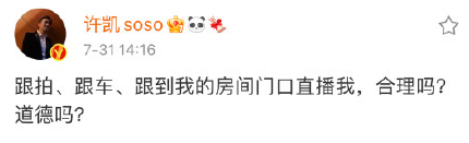 有时被骚扰的过分了,艺人自己也会忍不住发文怒斥,比如演员许凯,曾怒喷私生饭跟到自己的房间门口直播。