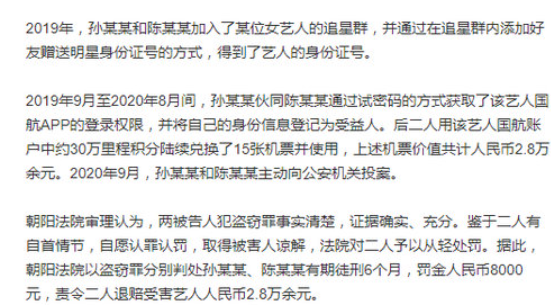 私生盗用明星里程积分兑15张机票!还盗取身份证号,被判刑6个月