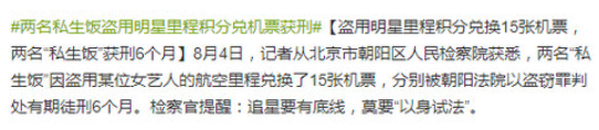 8月4日,据报道,两名私生饭因为盗用明星的航空里程积分被判刑6个月,迅速引起网友热议。