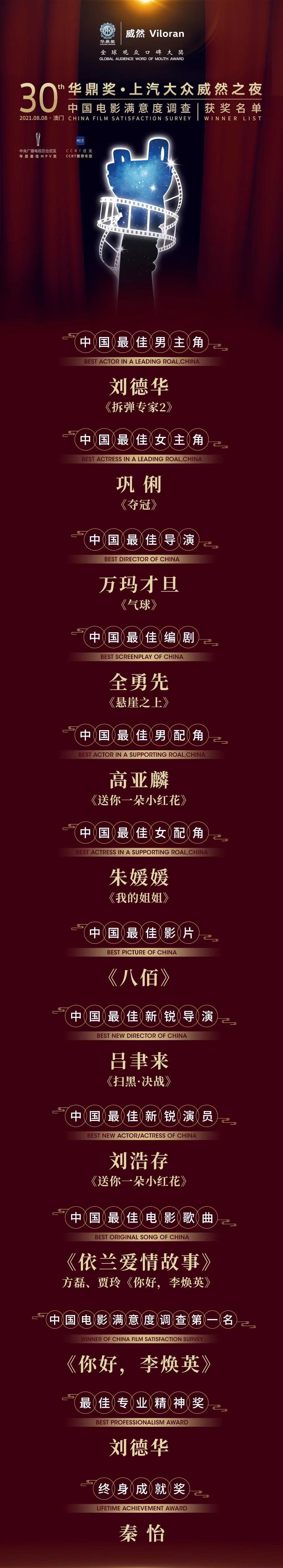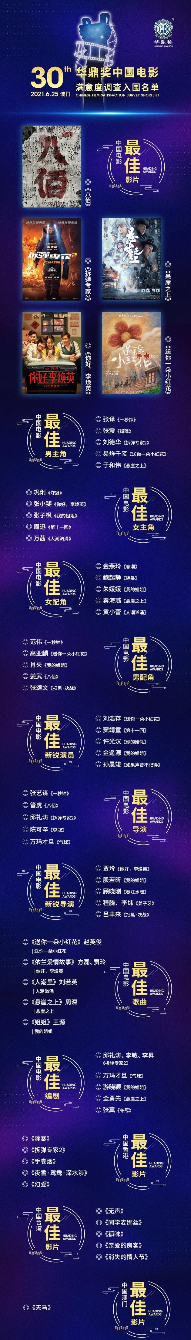 序言:2021年8月6日,第30届华鼎奖“中国电影满意度调查”发布盛典,在中国澳门以无嘉宾、无观众、无媒体的模式线上发布。原定8月8日晚举行盛大颁奖典礼的华鼎奖组委会,提前揭晓本届华鼎奖各大奖项。