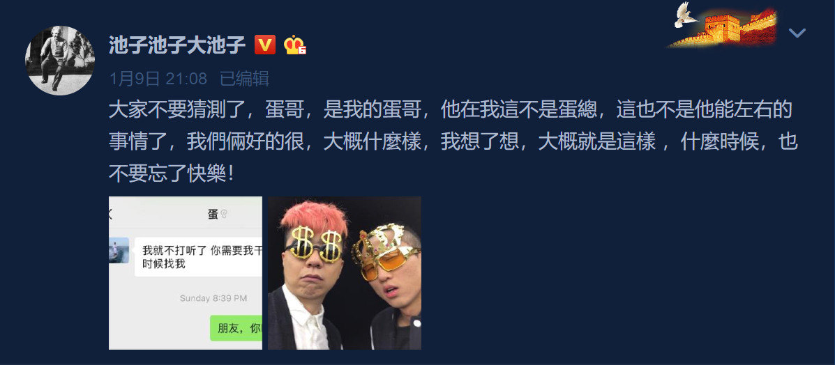 随后,池子还回应了他与李诞不和传闻,“大家不要猜测了,我俩好得很。”并配了一张二人的合影。