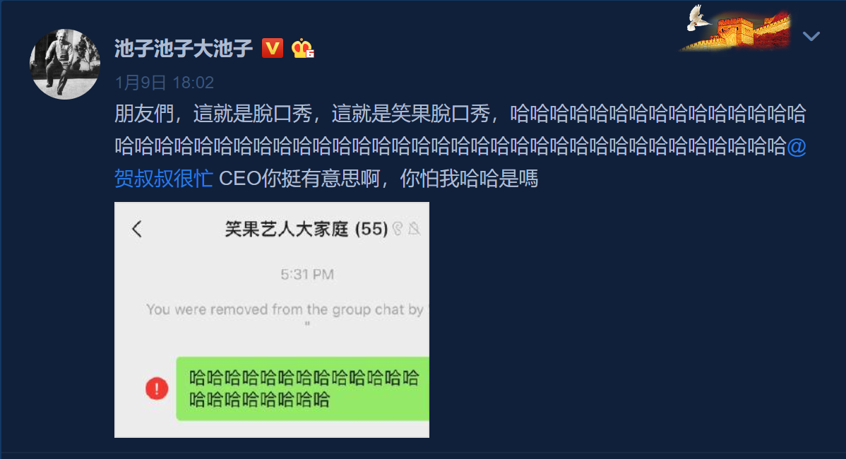 新京报讯 1月9日,脱口秀演员池子在微博分享了一张,自己被所属公司笑果文化移出群聊的截屏,他写道“朋友们,这就是脱口秀,这就是笑果脱口秀”。并@了笑果文化CEO贺晓曦,“CEO你挺有意思啊,你怕我是吗?”这段文字引发了热议。