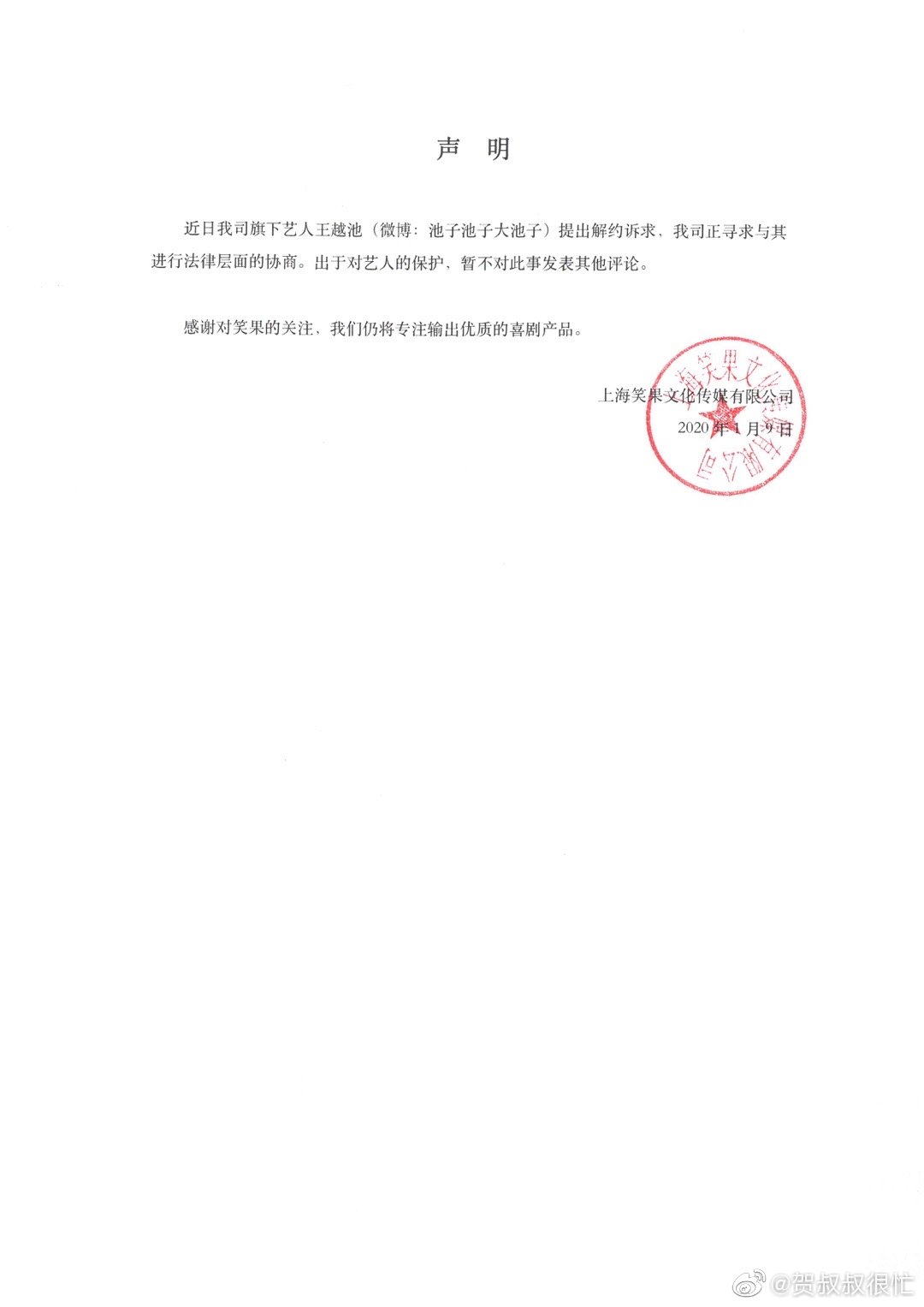 1月10日一早,贺晓曦在微博发表了公司声明,声明中称,“近日我司旗下艺人王越池(池子)提出解约诉求,我司正寻求与其进行法律层面的协商。出于对艺人的保护,暂不对此事发表其他评论。”