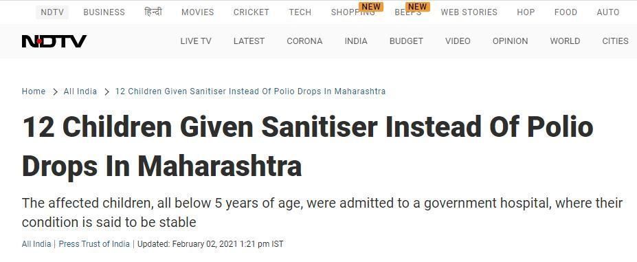 据印度新德里电视台(NDTV)等印媒报道,1月31日,是印度今年脊髓灰质炎疫苗的全国接种日。当天在印度马哈拉施特拉邦亚瓦特马尔县(Yavatmal)的一个村庄,医务人员为12名儿童失误滴服了消毒剂,而不是应该接种的脊髓灰质炎疫苗。当地政府官员潘查尔(Shrikrishna Panchal)2月1日表示,这是一次“重大的疏忽”。