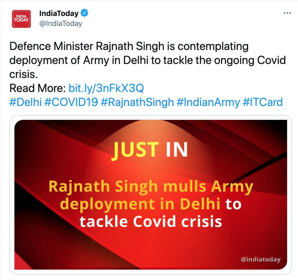 “今日印度”5月3日在推特账号表示,印度国防部长正在考虑在德里部署军队,以应对当前的新冠危机。